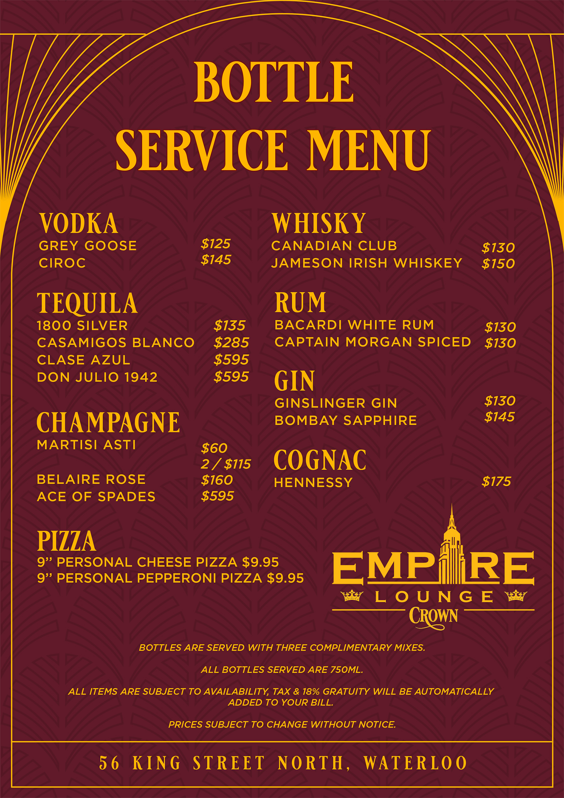 Bottle Service Menu